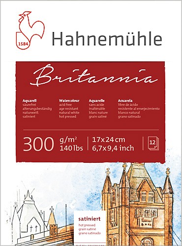 Blok Britannia 300gsm zawiera 12 kartek papieru akwarelowego o powierzchni satynowej w kolorze naturalnej bieli. Papier akwarelowy Britannia 300 gsm jest bezkwasowy, odporny na światło i w najwyższym stopniu odporny na starzenie. Dzięki swojej grubości i wytrzymałości, papier jest niezwykle stabilny po namoczeniu. Twarda powierzchnia zapewnia łatwe nakładanie farb. Bloki klejone są wzdłuż wszystkich krawędzi z siatką bawełnianą, co zapewnia płaską powierzchnię papieru nawet po namoczeniu. Blok Przeznaczony jest do wszystkich technik akwarelowych (zwłaszcza do techniki "mokrym w mokrym"). Może być również używany do techniki "suchego pędzla". Doskonale nadaje się również do technik: gwaszu, tempery, akrylu.