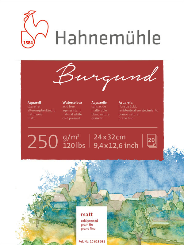 Blok Burgund 250g zawiera 20 kartek naturalnie białego papieru akwarelowego o delikatnie szorstkiej powierzchni. Klejony wzdłuż wszystkich krawędzi. Papier jest bezkwasowy, odporny na światło, o najwyższej odporności na starzenie. Polecany do wszystkich technik akwarelowych, ale szczególnie do techniki „mokrym w mokrym”. Umożliwia dokonywanie korekt, co oznacza, że niewyschniętą jeszcze farbę można wymyć pędzlem aż do bieli papieru. Nadaje się również do malowania gwaszem i temperą.
