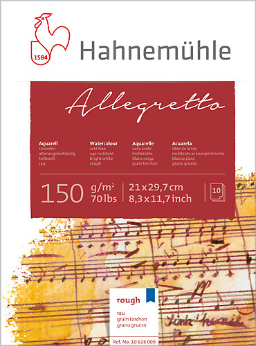 Blok Hahnemuhle Allegretto o gramaturze 150 gsm zawiera 10 kartek białego, bezkwasowego papieru o pięknej lekko szorstkiej fakturze. Papier jest odporny na działanie światła i o najwyższej odporności na starzenie. Idealny dla początkujących akwarelistów. Doskonale nadaje się do tworzenia rysunków piórkiem i lawowania ich akwarelą lub temperą, rysunku tuszem oraz do wszystkich suchych technik malarskich takich jak: węgiel, kredka, ołówek, pastele. Papier dostępny w blokach i arkuszach.