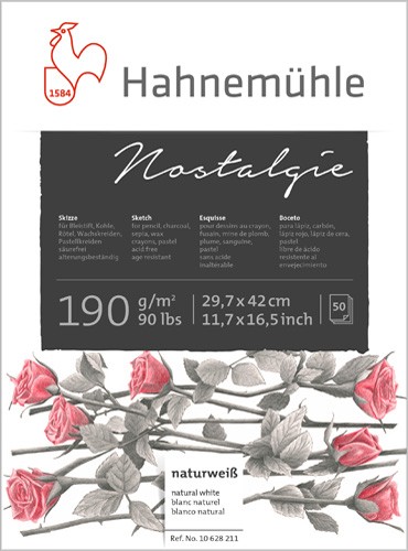 Blok Nostalgie 190 gsm zawiera 50 kartek grubego papieru do rysunku i szkiców. Jest naturalnie biały i posiada piękną delikatną fakturę. Dzięki tej fakturze możliwe jest zarówno rozcieranie koloru w kierunku delikatnych plam, jak również poprowadzenie bardzo intensywnej i mocnej w kolorze kreski. Podobnie jak inne papiery Hahnemühle jest bezkwasowy i odporny na starzenie. Polecany jest do wszystkich technik suchych. Blok klejony wzdłuż górnej krawędzi.