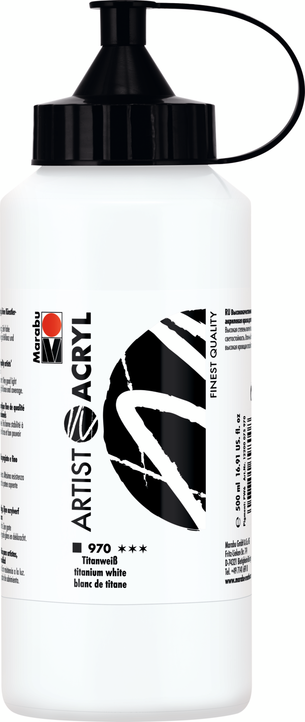 W pełni kryjąca, czysta biel, świetlista biel. Idealna do rozjaśniania (rozbielania) innych kolorów. Ma największe krycie i siłę barwienia ze wszystkich bieli akrylowych Marabu. Alternatywa dla półkryjącej bieli Buff titanium light (902). Jest kolorem jednopigmentowym. Farba o dobrej odporności na światło.