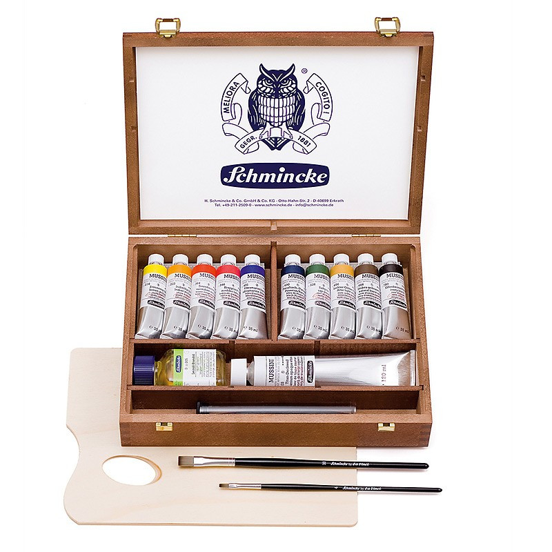 Zestaw wysokiej jakości farb olejno - żywicznych MUSSINI w drewnianej kasecie, przeznaczony dla wymagających artystów i konserwatorów. Zestaw zawiera: