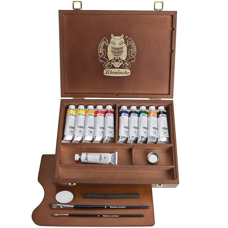 Piękny zestaw wysokiej jakości farb olejnych z serii Norma Professional w drewnianej kasecie. Idealny na prezent. Zawiera: