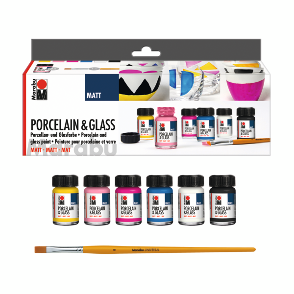 Zestaw matowych farb do porcelany i szkła Marabu PORCELAIN & GLASS Matt - 6 x 15 ml + pędzel - art. 1116000000087