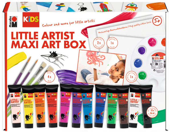 Poszerzony zestaw farb Marabu Little Artist Art Box wraz akcesoriami to idealny zestaw prezentowy dla dzieci od 5 lat z doświadczeniem malarskim, które „chcą czegoś więcej”. Dzięki dużemu wyborowi kolorów farb i dołączonych do nich akcesoriom malarskich dzieci mogą tworzyć swobodnie, ile dusza zapragnie.
