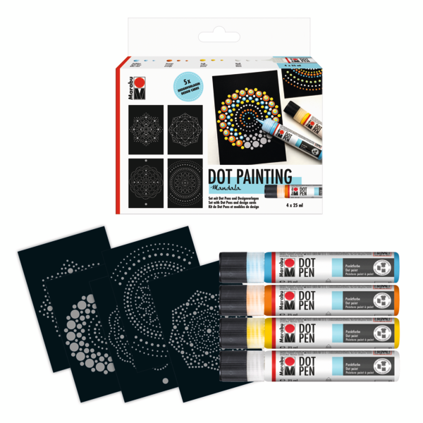 Twórz kolorowe prace z zestawem Marabu Dot Pen „Mandala”! Zestaw zawiera 4 pisaki w wybranych kombinacjach kolorów, instrukcje i 5 ekskluzywnych kartek projektowych w formacie pocztówki, które można indywidualnie kropkować za pomocą pisaków. Karty projektowe w formacie DIN A6 są drukowane w kolorze z pięknymi motywami cyrkowymi. Farba w pisaku jest na bazie wody a po wyschnięciu jest matowa i tworzy efekt wypukły tzw. 3D na malowanej powierzchni.
