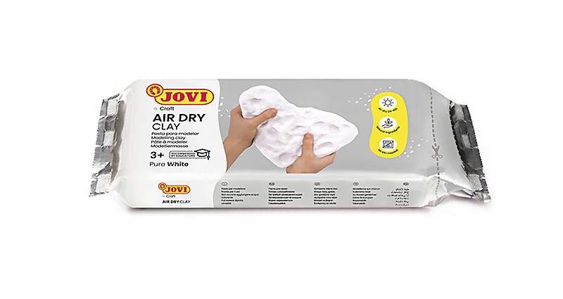 Samoutrwardzalna masa modelarska Jovi Air Dry na bazie gliny, w kolorze białym stworzona do modelowania i rzeźbienia. Przeznaczona jest zarówno dla starszych, zaawansowanych jak i najmłodszych, początkujących rzeźbiarzy. Wysycha na powietrzu, uzyskując dużą twardość. Po obróbce niewymagająca wypalania w piecu. Czas wysychania to 24 do 48 godzin. Jest bardzo plastyczna, łatwa w formowaniu, ma miękką konsystencję gotową do pracy zaraz po rozpakowaniu. Wyschniętą można pomalować flamastrami, farbami akrylowymi czy plakatowymi i polakierować w celu zabezpieczenia. Masę po rozpakowaniu należy przechowywać w szczelnie zamkniętym pojemniku. nie traci wtedy swoich właściwości. Nadaje się także dla dzieci powyżej 3 lat. Produkt hiszpańskiej firmy "Jovi"