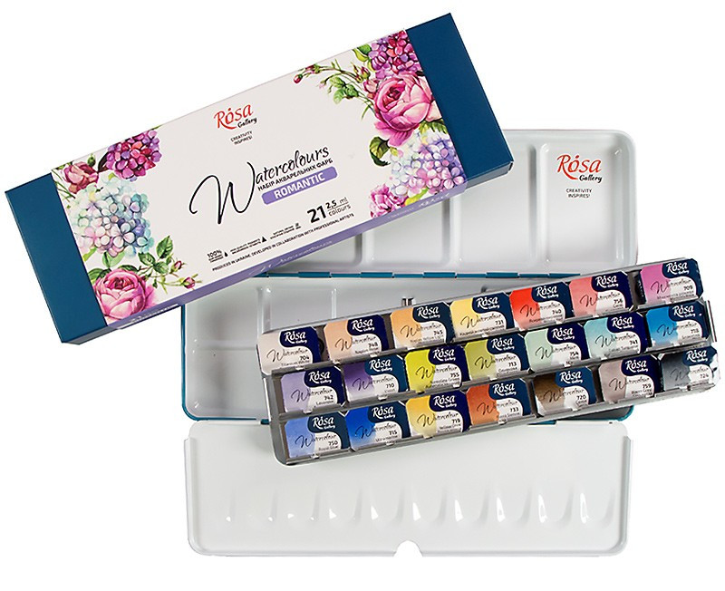 Komplet ROMANTIC w metalowej kasecie zawiera 21 kolorów wysokiej jakości farb akwarelowych Watercolour Rosa Gallery w kostkach o pojemności 2,5 ml. Większość kolorów to kolory jednopigmentowe, dzięki czemu w wyniku mieszania można uzyskać wiele czystych ościeni. Paleta kolorów została skomponowana na potrzeby tworzenia prac z motywami kwiatowymi, ilustracji z modą i innych motywów i wzorów. Można kupić pustą metalową kasetę (2311202).