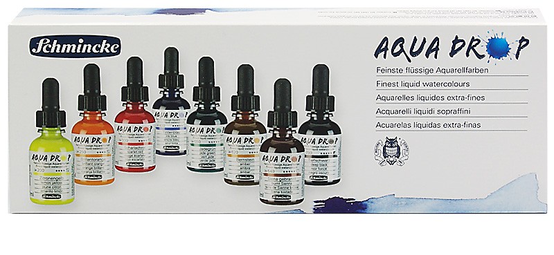 Komplet doskonałej jakości płynnych farb akwarelowych serii AQUA DROP w kartonowym opakowaniu zawierający 8 kolorów w plastikowej butelce z pipetą o pojemności 30 ml. Idealne do technik: malarstwo akwarelowe, kaligrafia, liternictwo oraz malarstwo aerografem (nie mniej niż 0,15 mm)