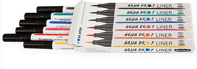 Komplet doskonałej jakości płynnych farb akwarelowych w linerach serii AQUA DROP. Końcówki linerów mają kształt giętkich, elastycznych pędzelków, co umożliwia malowanie cienkich i grubszych linii. Zestaw w kartonowym opakowaniu zawiera 6 kolorów. Idealne do technik: malarstwo akwarelowe, kaligrafia, liternictwo. Linery można ponownie napełniać odpowiednimi kolorami AQUA DROP.