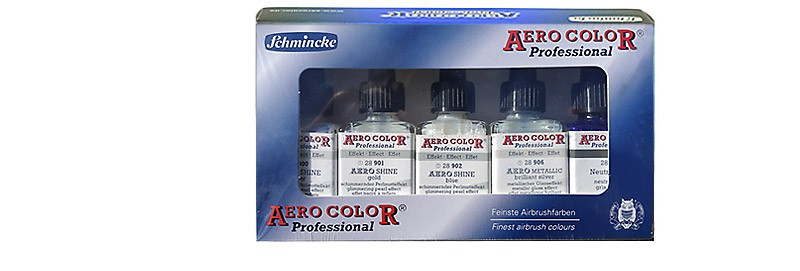 Limitowany zestaw płynnych farb akrylowych firmy Schmincke z serii AERO COLOR Professional przeznaczonych do aerografu zawierający 5 kolorów w buteleczkach z pipetą o pojemności 28 ml z czego 4 kolory to farby z efektami. Farbami można malować również przy użyciu pędzla, piórka, rapitografu.
