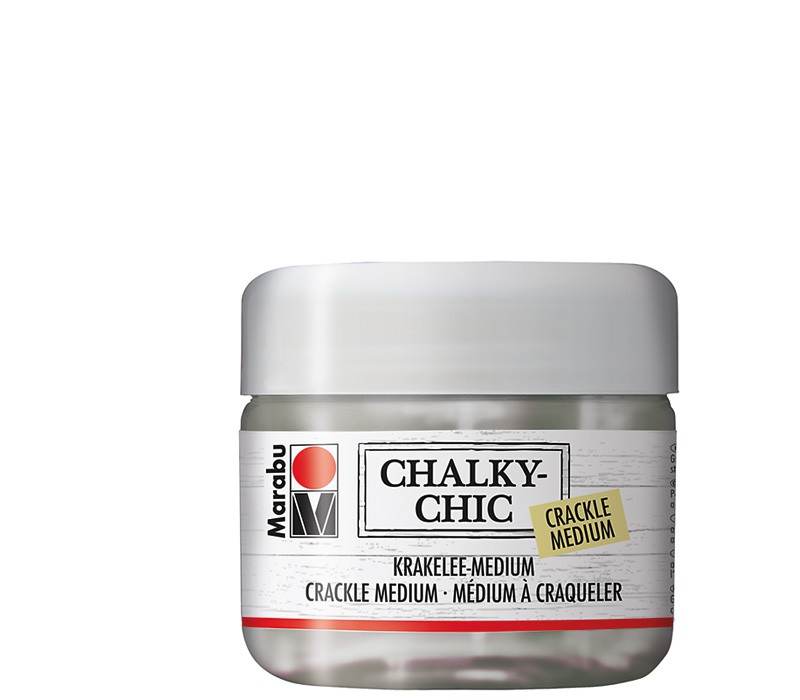 Marabu CHALKY-CHIC CRACLE MEDIUM to przezroczyste medium na bazie wody do efektu delikatnych spękań (postarzania przedmiotu). Powierzchnię przedmiotu należy oczyścić z kurzu i odtłuścić, pomalować używając pędzla albo wałka. Pozostawić do wyschnięcia 30 min. Nanieść równomiernie medium do spękań i ponownie pozostawić do wyschnięcia. Jako ostatnią warstwę zdecydowanymi ruchami pędzla nanosimy farbę CHALKY CHIC innego koloru. Efekt spękań uzyskujemy natychmiast. W zależności od grubości warstwy i kierunku malowania, zarówno medium jak i farby, uzyskamy różne spękania, pozwalają one prześwitywać pierwszej warstwie koloru dodając przedmiotom tajemniczej głębi.