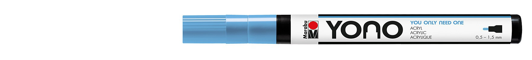 Marabu YONO Marker to uniwersalny marker akrylowy odpowiedni do pisania na niemal każdej powierzchni w tym na: metalu, szkle, porcelanie, drewnie, tkaninach, kamieniu, plastiku oraz płótnie. Mokry kolor może być mieszany, rozcieńczany lub użyty jako akwarela, po wyschnięciu staje się wodoodporny o matowym wykończeniu. Markery YONO wyposażone są w wysokiej jakości wymienne, japońskie końcówki, występują w trzech wariantach – 2 okrągłe i 1 ścięta. Szerokość linii pisania z końcówką 0,5-1,5 mm, 1,5-3 mm, 0,5-5 mm.