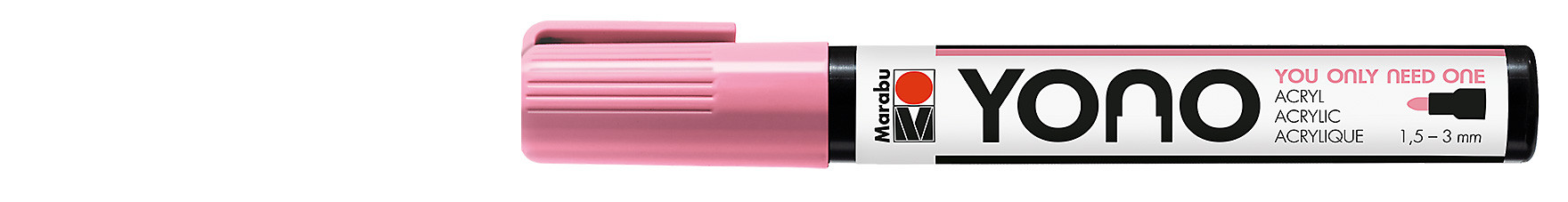 Marabu YONO Marker to uniwersalny marker akrylowy odpowiedni do pisania na niemal każdej powierzchni w tym na: metalu, szkle, porcelanie, drewnie, tkaninach, kamieniu, plastiku oraz płótnie. Mokry kolor może być mieszany, rozcieńczany lub użyty jako akwarela, po wyschnięciu staje się wodoodporny o matowym wykończeniu. Markery YONO wyposażone są w wysokiej jakości wymienne, japońskie końcówki, występują w trzech wariantach – 2 okrągłe i 1 ścięta. Szerokość linii pisania z końcówką 0,5-1,5 mm, 1,5-3 mm, 0,5-5 mm.