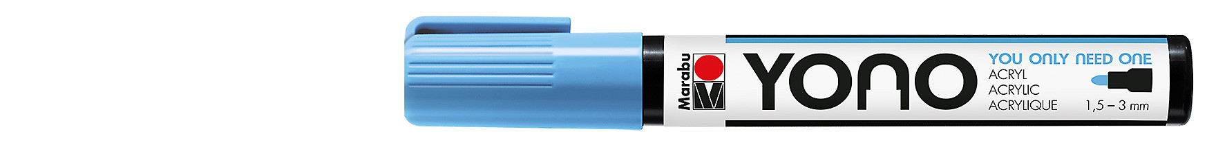 Marabu YONO Marker to uniwersalny marker akrylowy odpowiedni do pisania na niemal każdej powierzchni w tym na: metalu, szkle, porcelanie, drewnie, tkaninach, kamieniu, plastiku oraz płótnie. Mokry kolor może być mieszany, rozcieńczany lub użyty jako akwarela, po wyschnięciu staje się wodoodporny o matowym wykończeniu. Markery YONO wyposażone są w wysokiej jakości wymienne, japońskie końcówki, występują w trzech wariantach – 2 okrągłe i 1 ścięta. Szerokość linii pisania z końcówką 0,5-1,5 mm, 1,5-3 mm, 0,5-5 mm.