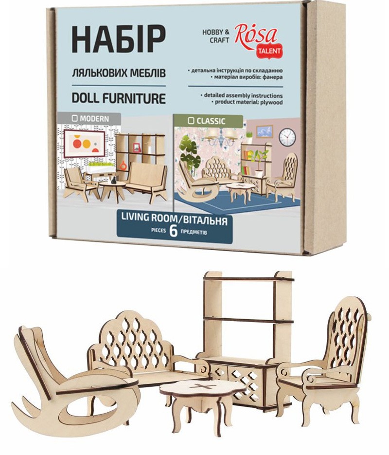 Meble pokojowe dla lalek w stylu klasycznym ROSA TALENT wykonane są z naturalnego materiału - sklejki. Gładkie krawędzie, płaska powierzchnia, jasna barwa i faktura drewna pozwalają na zabawę nawet bez dodatkowej dekoracji. Są łatwe w montażu dzięki prostej i przejrzystej konstrukcji. Aby uzyskać mocne połączenie części, zaleca się użycie kleju. Do malowania mebli świetnie nadają się farby akrylowe np Rosa Talent. Meblowanie domu dla lalek to doskonała okazja dla rodziców do spędzenia czasu z dzieckiem w ciekawy i pożyteczny sposób.