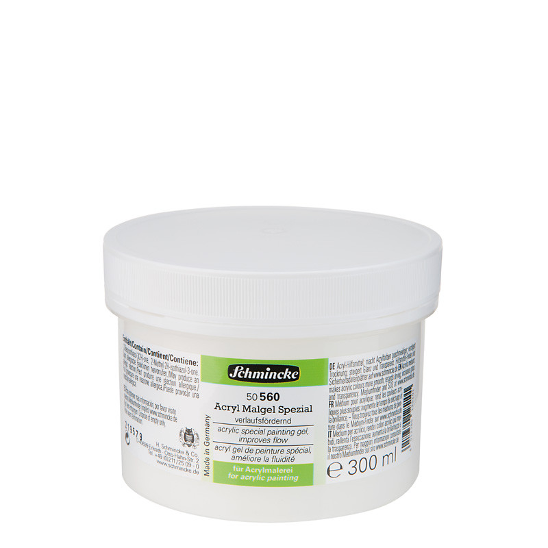 Żel malarski firmy Schmincke łączy w sobie różne możliwości technik malarskich. Posiada cechy delikatnego transparentnego żelu, nadaje farbie charakter gęstej pasty i jednocześnie wydłuża czas schnięcia. Farby akrylowe zmieszane z tym medium w stosunku 1:1 nabierają gęstości farb olejnych, bardzo łatwo rozprowadzają się pędzlem i umożliwiają osiągnięcie efektów identycznych jak w malarstwie olejnym.