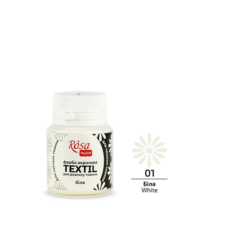 ROSA TALENT TEXTIL to wodne farby akrylowe do malowania tkanin, skóry i zamszu. Farby te są mocno nasycone pigmentem, dzięki czemu, wyróżniają się doskonałą siłą krycia i mogą być stosowane do jasnych, jak i ciemnych tkanin, naturalnych oraz syntetycznych. Głęboko wnikają w włókna tkaniny bez jej nadmiernego zagęszczania. Tkanina powinna być sucha i czysta. Należy umieść folię pomiędzy jej warstwami, by zapobiec wyciekaniu farby. Farbę można rozcieńczyć wodą lub rozcieńczalnikiem do farb do tkanin. Po wyschnięciu obraz utrwala się prasując żelazkiem (bez pary) w temperaturze dostosowanej do tkaniny, przez papier lub szmatkę, min. 5 minut lub w piekarniku nagrzanym do 120°C przez 20 minut. Całkowite utrwalenie bez prasowania i podgrzewania uzyskuje się w ciągu 48 godzin.