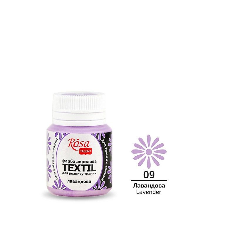 ROSA TALENT TEXTIL to wodne farby akrylowe do malowania tkanin, skóry i zamszu. Farby te są mocno nasycone pigmentem, dzięki czemu, wyróżniają się doskonałą siłą krycia i mogą być stosowane do jasnych, jak i ciemnych tkanin, naturalnych oraz syntetycznych. Głęboko wnikają w włókna tkaniny bez jej nadmiernego zagęszczania. Tkanina powinna być sucha i czysta. Należy umieść folię pomiędzy jej warstwami, by zapobiec wyciekaniu farby. Farbę można rozcieńczyć wodą lub rozcieńczalnikiem do farb do tkanin. Po wyschnięciu obraz utrwala się prasując żelazkiem (bez pary) w temperaturze dostosowanej do tkaniny, przez papier lub szmatkę, min. 5 minut lub w piekarniku nagrzanym do 120°C przez 20 minut. Całkowite utrwalenie bez prasowania i podgrzewania uzyskuje się w ciągu 48 godzin.