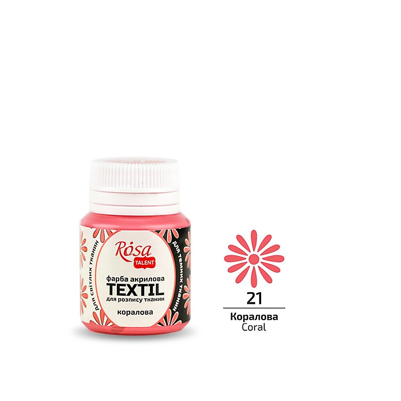 ROSA TALENT TEXTIL to wodne farby akrylowe do malowania tkanin, skóry i zamszu. Farby te są mocno nasycone pigmentem, dzięki czemu, wyróżniają się doskonałą siłą krycia i mogą być stosowane do jasnych, jak i ciemnych tkanin, naturalnych oraz syntetycznych. Głęboko wnikają w włókna tkaniny bez jej nadmiernego zagęszczania. Tkanina powinna być sucha i czysta. Należy umieść folię pomiędzy jej warstwami, by zapobiec wyciekaniu farby. Farbę można rozcieńczyć wodą lub rozcieńczalnikiem do farb do tkanin. Po wyschnięciu obraz utrwala się prasując żelazkiem (bez pary) w temperaturze dostosowanej do tkaniny, przez papier lub szmatkę, min. 5 minut lub w piekarniku nagrzanym do 120°C przez 20 minut. Całkowite utrwalenie bez prasowania i podgrzewania uzyskuje się w ciągu 48 godzin.