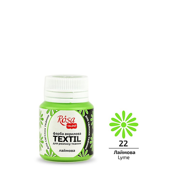 ROSA TALENT TEXTIL to wodne farby akrylowe do malowania tkanin, skóry i zamszu. Farby te są mocno nasycone pigmentem, dzięki czemu, wyróżniają się doskonałą siłą krycia i mogą być stosowane do jasnych, jak i ciemnych tkanin, naturalnych oraz syntetycznych. Głęboko wnikają w włókna tkaniny bez jej nadmiernego zagęszczania. Tkanina powinna być sucha i czysta. Należy umieść folię pomiędzy jej warstwami, by zapobiec wyciekaniu farby. Farbę można rozcieńczyć wodą lub rozcieńczalnikiem do farb do tkanin. Po wyschnięciu obraz utrwala się prasując żelazkiem (bez pary) w temperaturze dostosowanej do tkaniny, przez papier lub szmatkę, min. 5 minut lub w piekarniku nagrzanym do 120°C przez 20 minut. Całkowite utrwalenie bez prasowania i podgrzewania uzyskuje się w ciągu 48 godzin.