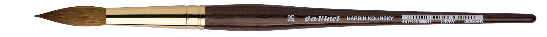 Pędzel akwarelowy wykonany z włosia Hrabin-Kolinsky z czerwonego sobola. Włosie w naturalny sposób zwęża się ku końcowi tworząc niezwykle ostry czubek. Dzięki temu pędzel jest sprężysty i bardzo precyzyjny. Budowa pędzla i rodzaj włosia zapewniają również doskonałe pochłanianie farby. Bezszwowa skuwka w kolorze złotym, krótka lakierowana rączka.