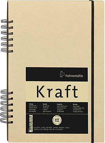 Szkicownik Hahnemühle Kraft Paper Sketch Book 120 gsm posiada specjalny, bezkwasowy papier w kolorze ochry, czyniąc tło każdego rysunku unikatowym. Dostępny w twardej oprawie na spirali z gumką - sztywną okładkę można całkowicie rozłożyć, co daje solidną podstawę do rysowania. Szkicownik dostępny jest w formatach A4 i A5. Lekko szorstki papier jest idealny do rysowania ołówkiem, węglem, sangwiną, kredkami jak również pastelami.