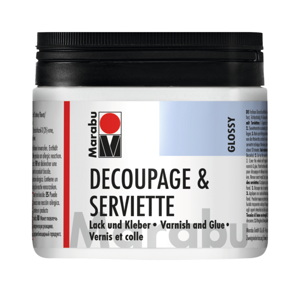 Idealny do techniki decoupage i serwetkowej klej błyszczacy werniks w jednym. Decoupage to bardzo prosta technika zdobnicza polegająca na naklejaniu wzorzystego cienkiego papieru na przedmioty o różnorakich powierzchniach. Wzór można wyciąć, po czym należy zabezpieczyć go kilkoma warstwami werniksu do decoupage, tak by uzyskać gładką jednorodną powierzchnię. Wybrany przedmiot przed nałożeniem wzoru można pomalować farbą akrylową. Do tej metody dekorowania świetnie nadają się serwetki - wtedy mówimy o technice serwetkowej. Techniką tą upiększa się przedmioty z drewna, metalu, szkła, a nawet tekstylia. Jest to technika odpowiednia dla każdego, żadne specjalne zdolności plastyczne nie są tu potrzebne, liczy się pomysłowość.