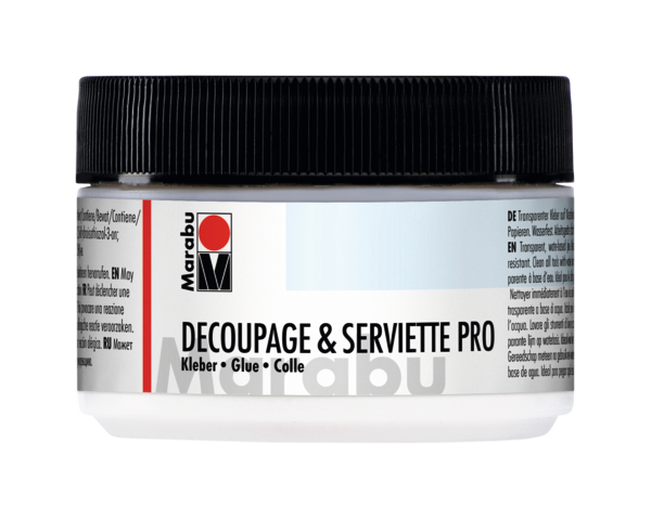 Przezroczysty wodny klej idealny do techniki decoupage i serwetkowej. Decoupage tobardzo prosta technika zdobnicza polegająca na naklejaniu wzorzystego cienkiego papieru na przedmioty o różnorakich powierzchniach. Wzór można wyciąć. Przedmiot przed nałożeniem wzoru należy pomalować farbą akrylową Decormatt i poczekać aż całkiem wyschnie. Nanieść pędzlem Decoupage & Serviette Glue Pro. Na mokry klej delikatnie nałożyć cienką warstwę serwetki z wzorem. Zawerniksować werniksem do decoupage nakładając go ostrożnie miękkim pędzlem od środka ku brzegom. Pozostawić do wyschnięcia. Wodoodporny po wyschnięciu.