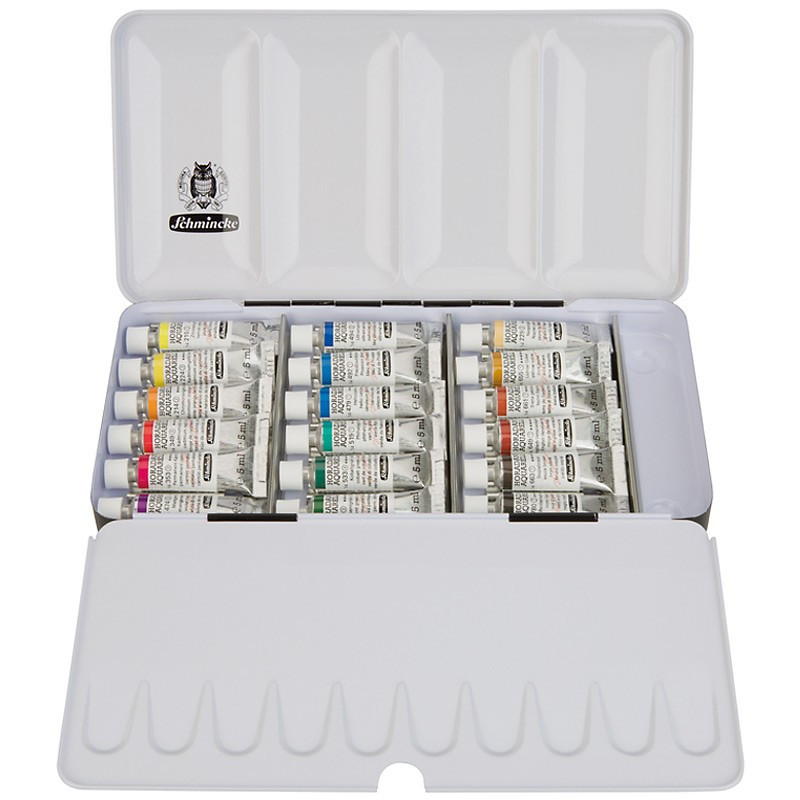 Komplet najwyższej jakości farb akwarelowych Schmincke Horadam zawierający 18 kolorów w tubkach o pojemności 5 ml. Całość zamknięta w metalowej kasecie. Przeznaczony jest dla profesjonalnych artystów. Można kupić pustą kasetkę (74 918) o wymiarach 23,1 dł. x 11,6 szer. x 3,0 cm wys.