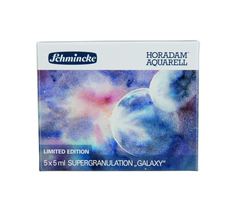 Komplet najwyższej jakości farb akwarelowych Schmincke Horadam nalężący do specjalnej serii "Galaxy". Kartonowe opakowanie zawiera 5 tubek o pojemności 5 ml. Te niezwykłe kolory powstały poprzez połączenie co najmniej dwóch granulujących pigmentów, zwiększając tym efekt i osiągając tzw. "supergranulację".