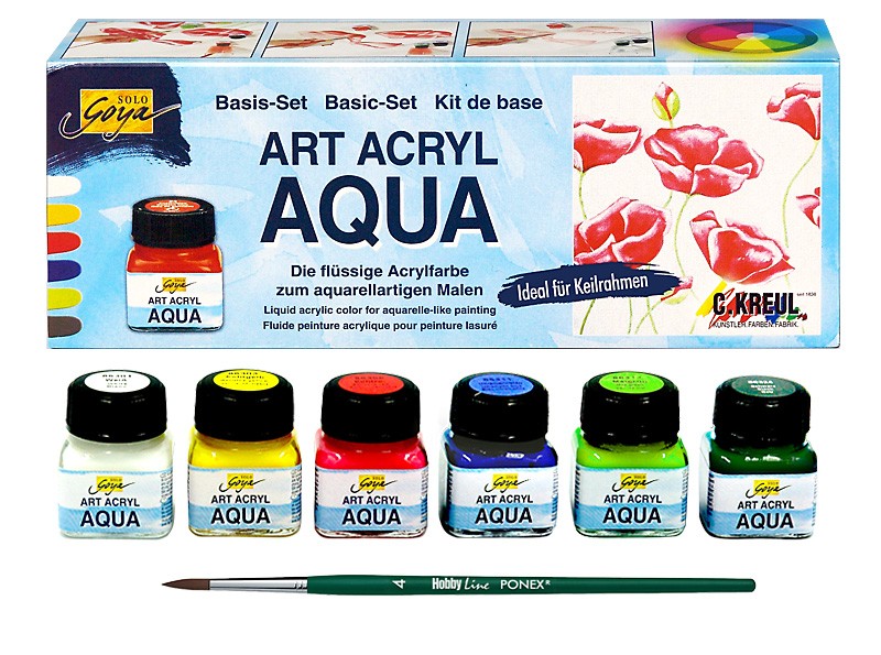 Komplet płynnych farb akrylowych na bazie wody o charakterze akwareli. Do malowania laserunkowego na papierze, zagruntowanym płótnie i drewnie. Tak jak w akwareli, laserunki można nakładać. Farby rozcieńcza się wodą. Najlepiej malować miękkim pędzlem do akwareli. Wszystkie kolory można mieszać. Odporne na działanie światła i ślinę, po wyschnięciu wodoodporne.