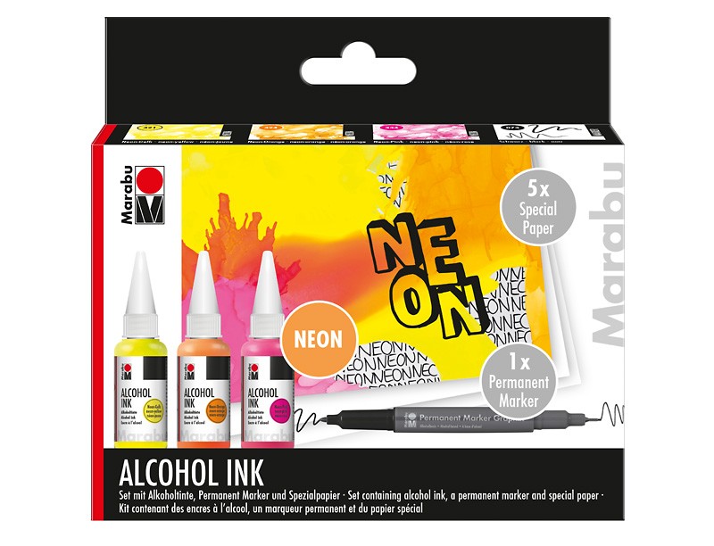 Zestaw trzech permanentnych tuszy na bazie alkoholu o świetlistym, żywym, nasyconym kolorze. Tusz szybko wysycha, nie zawiera kwasów, jest transparentny. Przeznaczony do malowania na powierzchniach nie absorbujących wody takich jak: wodoodporny papier syntetyczny, szkło, metal, ceramika, plastik.