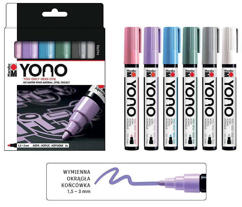 Marabu YONO Marker to uniwersalny marker akrylowy odpowiedni do pisania na niemal każdej powierzchni w tym na metalu, szkle, porcelanie, drewnie, tkaninach, kamieniu, plastiku oraz płótnie. Mokry kolor może być mieszany, rozcieńczany lub użyty jako akwarela, po wyschnięciu staje się wodoodporny. Markery YONO charakteryzują się żywymi, matowymi kolorami, są silnie kryjące i odporne na działanie światła. Zestaw zawiera 4 markery w kolorach metalicznych z wymienną okrągłą końcówką o szerokości pisania 1,5 -3 mm.