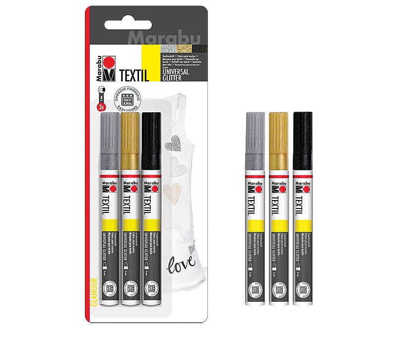Zestaw 3 markerów brokatowych do jasnych i ciemnych tkanin firmy Marabu. Markery nadają się do wszystkich tkanin, zarówno naturalnych jak i syntetycznych. Napełnione wodną farbą o przyjemnym zapachu, są całkowicie bezpieczne dla dzieci. Po namalowaniu należy odłożyć tkaninę do wyschnięcia, a następnie wyprasować (bez pary) po lewej stronie lub utrwalić w piekarniku przez 8 min. w 150° C. Pomalowane tkaniny można prać w temp. 40° C