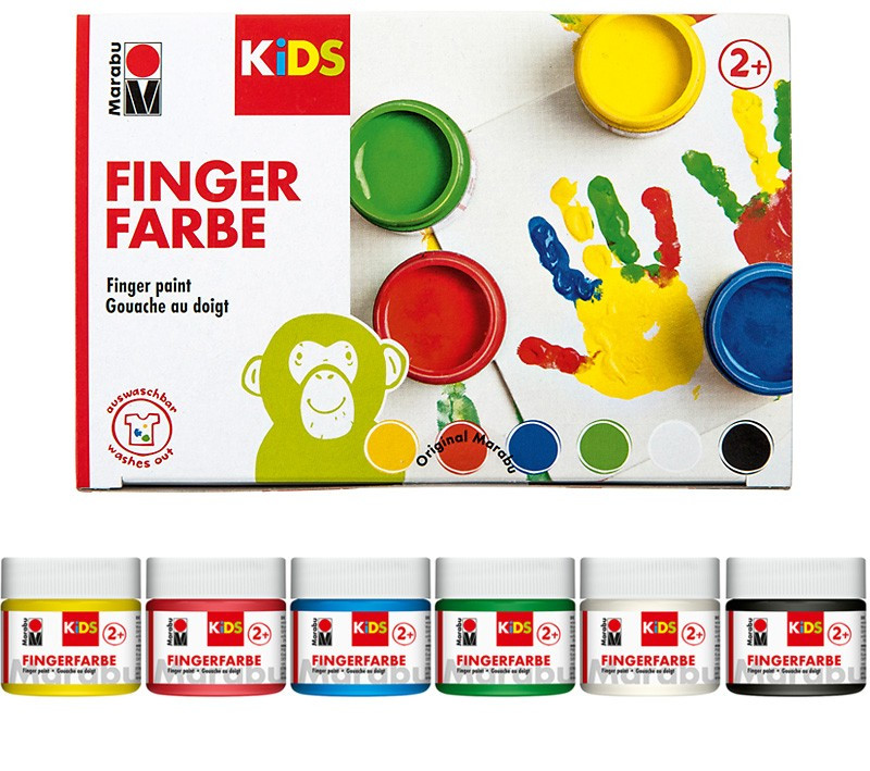 Komplet farb wodnych Marabu KiDS FINGERFARBE łatwych w aplikacji, wprost idealnych do spontanicznego malowania. Farbę o kremowej konsystencji można łatwo nakładać palcami, dłońmi, gąbką, szpatułką lub pędzlem na papierze, tekturze, drewnie, szkle (oknach) i folii. Kolory można ze sobą mieszać, nie kapią, są mocno kryjące i szybkoschnące. Farby spełniają wymogi artykułu dla dzieci, do ich produkcji używane są wyłącznie specjalne konserwanty i pigmenty i dodaje się gorzką substancję, aby chronić przed niepożądanym spożyciem. Są bezpieczne, mogą być używane przez dzieci w wieku powyżej 2 lat. Plamy z farb na tekstyliach łatwo się piorą.